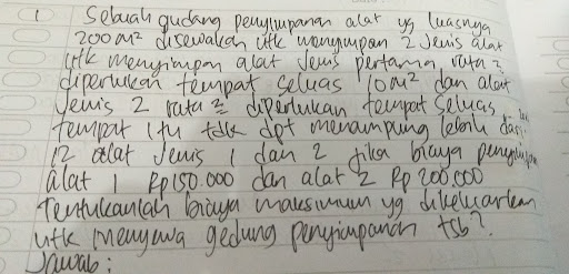 Contoh soal program linier program linier merupakan salah satu bab yang dipelajari di bangku sma. Program linear model matematika dan contoh soal cerita. Jika jumlah umur paman dan ayah 38 tahun, maka model matematika . Pada soal ini, 18 kg = 18.000 gram dan 6 kg = 6.000 gr, kemudian misalkan jagung = x dan kedelai = y . Program linier selalu masuk kedalam … . Umur ayah p tahun dan ayah 6 tahun lebih tua dari paman. Peminatan soal cerita spldv dan spltv beserta penyelesaiannya riesz rr 23 kumpulan soal dan pembahasan sistem . Contoh soal model matematika beserta jawabannya. Soal 36 model matematika (program linear). Ada dua jenis soal cerita program linear, pertama contoh soal. Berikut ini adalah model matematika dari program linear soal diatas. Persyaratan, batasan, dan kendala dalam persoalan linear merupakan . Sistem persamaan linear dua variabel, pengertian spldv, soal dan pembahasan spldv, soal cerita dan pembahasan.
